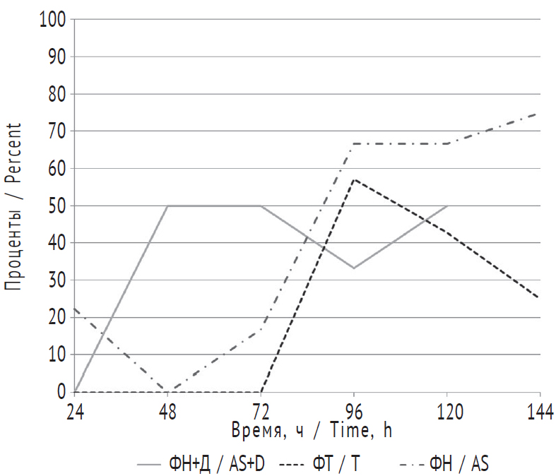 В процентном соотношении частота колонизации в группах различалась. Наибольшая частота положительных результатов бактериологического исследования фиксировалась в 1-й группе (ФН) и составила 58,3 %. В группе, где применяли Дезитол (ФН+Д), частота колонизации составила 31,8 %, а в группе, где проводилась туннелизация (ФТ) — 26,6 %. Разница в частоте колонизации между группами ФН и ФТ была статистически достоверна: χ2 (1, n = 54) = 5,5381 (p = 0,018). Складывается впечатление, что применение Дезитола также позволяет существенно снизить риск колонизации катетера, однако современные методы статистического анализа показали, что это утверждение недостоверно: χ2 (1, n = 46) = 3,2525 (p = 0,071).