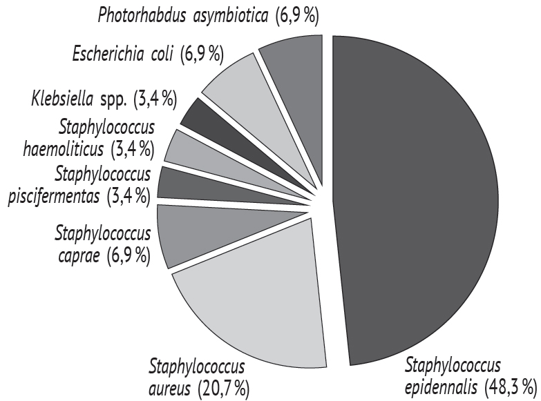 При первичном росте на плотных питательных средах материал пересевали на дифференциальные среды для уточнения качественного состава микробной флоры. Для идентификации микроорганизмов использовали наборы фирмы ErbaLachema (Чехия). Микроорганизмы рода Staphylococcus идентифицировали с помощью набора СТАФИ-тест 24, для биохимической идентификации клинически значимых микроорганизмов порядка Enterobacterales — ЭНТЕРО-тест 24, для идентификации до вида микроорганизмов рода Enterococcus — Энкоккус-тест, для идентификации грамотрицательных неферментирующих бактерий — НЕФЕРМ-тест. Родовая принадлежность микроорганизма определялась с помощью компьютерной программы Микроб-2 (Россия).