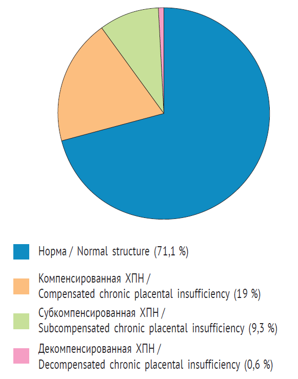 Был проведен анализ 357 историй родов, обменных карт, протоколов скринингового ультразвукового исследования в третьем триместре беременности и заключений патолого-анатомического исследования последов, проведенных в ГКУЗ «Ленинградское областное патолого-анатомическое бюро» (ЛОПАБ). Все пациентки были разделены на две группы по гистологическому строению плаценты: основную — имеющие последы с наличием хронической плацентарной недостаточности (ХПН), и контрольную с нормальным строением последа (реактивные, компенсаторно-реактивные и инволютивные изменения). В свою очередь пациентки основной группы были разделены на подгруппы в зависимости от стадии ХПН: компенсированной, субкомпенсированной и декомпенсированной. Нормальное состояние плацентарной ткани отмечалось у 254 (71 %) женщин, у 103 (29 %) пациенток выявлена хроническая плацентарная недостаточность. Гистологическое строение плаценты в группе исследования представлено на рис. 1.