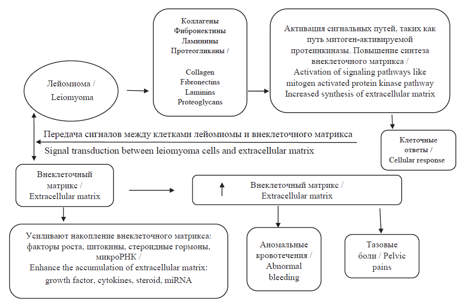 Доказано, что миома матки богата коллагеном, фибронектином, протеогликанами и ламининами, способными вызывать активацию сигнальных путей, таких как путь митоген-активируемой протеинкиназы, и приводить к усилению синтеза внеклеточного матрикса, следствием чего становятся клеточные ответы, которые участвуют в патогенезе и передаче сигналов между клетками лейомиомы и внеклеточным матриксом. M.S. Islam et al. также отмечают в своей работе взаимосвязь роста и развития мио мы матки с избыточным синтезом внеклеточного матрикса (рис. 2). Под действием факторов роста, таких как активин-А, трансформирующий фактор роста-β1, трансформирующий фактор роста-β3, тромбоцитарный фактор роста, повышенную экспрессию которых отмечают различные авторы, наблюдается повышенное отложение внеклеточного матрикса, а также цитокинов (фактор некроза опухоли-α), стероидных гормонов (эстроген и прогестерон) и микроРНК (miR-29, miR-200c и miR-93 / 106b). Именно высокое содержание внеклеточного матрикса играет ключевую роль в появлении основных симптомов миомы матки: аномальных кровотечений и тазовых болей [16, 19].