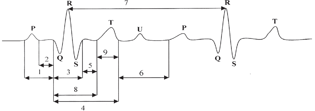 Оцениваемые параметры электрокардиограммы. P, Q, R, S, T, U — зубцы. 1, 3, 4, 6, 7, 8, 9 — интервалы PQ, QRS, QT, TP, RR соответственно. 2, 5 — сегменты PQ, R(S)T соответственно