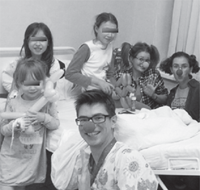 В крупных городах России основаны и волонтерские организации: «Больничные клоуны ХА» (Хабаровск), «Витамин К» (Кемерово), «С улыбкой — к каждому» (Пинск), «Партнеры по радости» (Томск). В 2015 г. в СПбГПМУ при поддержке Профсоюза учащихся (председатель Г.В. Кондратьев) был создан волонтерский проект «Магическая смехотерапия» (рис. 2), руководитель Н.А. Уваров. Активное вовлечение студентов СПбГПМУ в волонтерское движение содействует развитию личностных и профессиональных качеств будущих врачей (в особенности, педиатров), которые, получив ценный опыт общения с ребенком, смогут уделить больше внимания психоэмоциональной поддержке детей в своей работе. Команда волонтеров регулярно посещает детей клиники СПбГПМУ, совершает выходы в ДГБ № 22 г. Колпино, ДГБ № 19 им. Раухфуса, детскую инфекционную больницу № 3, онкологические диспансеры, детский хоспис, дом-интернат для детей с отклонениями в умственном развитии г. Павловска, педиатрическое отделение Тосненской клинической межрайонной больницы.
