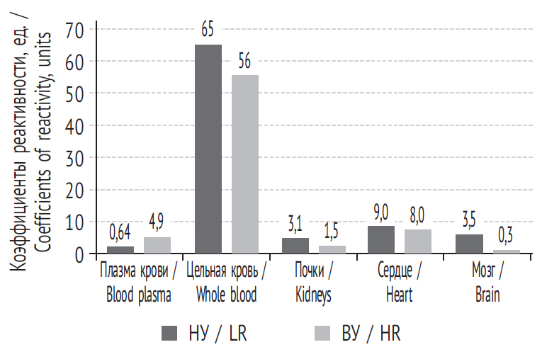 Figure. Coefficients of reactivity to moderate hypoxic exposure to the expression of the hypoxia-inducible factor HIF-1α in different tissues in groups of high- and low-resistant animals (HR and LR, respectively)