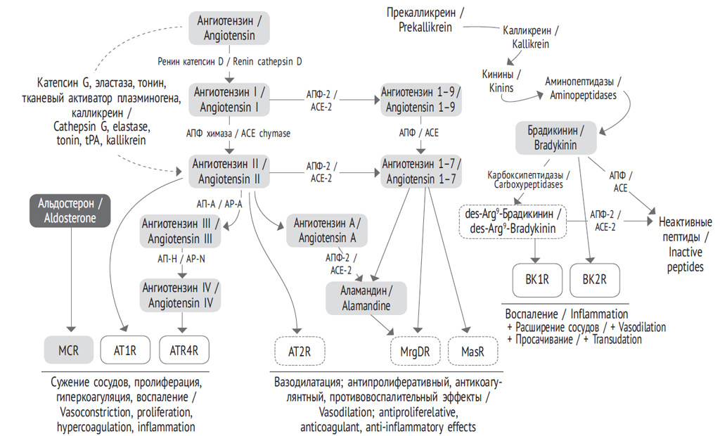 Заражение SARS-CoV-2 приводит к снижению количества и активности АПФ-2, что, в свою очередь, вызывает уменьшение образования кардио- и вазопротективного Анг 1–7, а также избыточное накопление «кардиотоксичного» Анг-II [60, 93]. Повышение уровня Анг-II ведет к поражению сердечно-сосудистой системы за счет механизмов и эффектов, описанных в предыдущем разделе. Кроме ССП повышение Анг-II при одновременном дефиците Анг 1–7 может потенцировать воспаление, создавая дополнительные предпосылки для развития цитокинового шторма и COVID-19-ассоциированной коагулопатии, характерных для тяжелых вариантов течения СOVID-19 [24, 51]. Наконец, угнетение АПФ-2 может приводить к дисбалансу в калликреин-кининовой системе с накоплением des-Arg9-брадикинина, обусловливающего повышение сосудистой проницаемости и, возможно, участвующего в патогенезе острого респираторного дистресс-синдрома (ОРДС) [42, 68, 98, 108, 116].