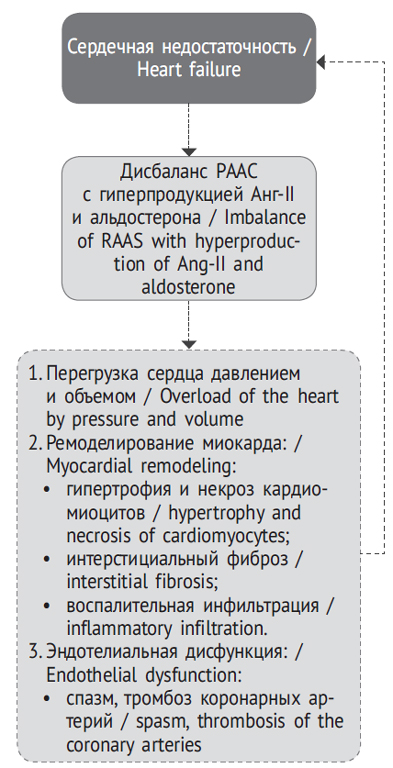 Таким образом, гиперактивация классической оси РААС ведет к поражению сердечно-сосудистой системы и прогрессированию гемодинамической (перегрузочной) и энергодинамической (миокардиальной) сердечной недостаточности, формируя порочный круг [36, 109] (рис. 2). Степень активации РААС определяет выживаемость пациентов с тяжелой сердечной недостаточностью [101].