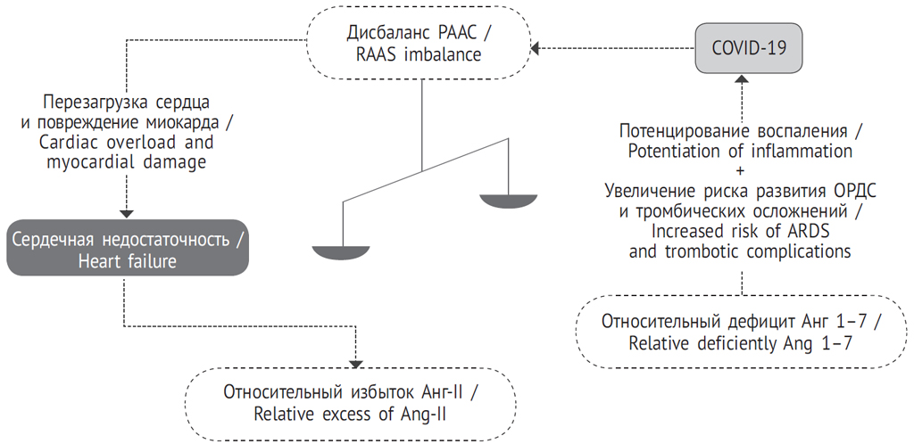 Дисбаланс РААС, выражающийся в гиперактивации оси АПФ/Анг-II/АТ1R и угнетении оси АПФ-2/Анг 1–7/MasR, — важное связующее патогенетическое звено между COVID-19 и ССП. У пациентов с ССЗ, ожирением, сахарным диабетом 2-го типа дисбаланс РААС имеется еще до заражения SARS-CoV-2. Коронавирусная инфекция усиливает этот дисбаланс и, таким образом, усугубляет поражение сердечно-сосудистой системы, обусловливая плохой прогноз у этой категории пациентов. При COVID-19 в сочетании с ССП возникают два порочных круга, взаимно усиливающих друг друга. Центральным звеном, связывающим эти порочные круги, служит дисбаланс РААС (рис. 3).