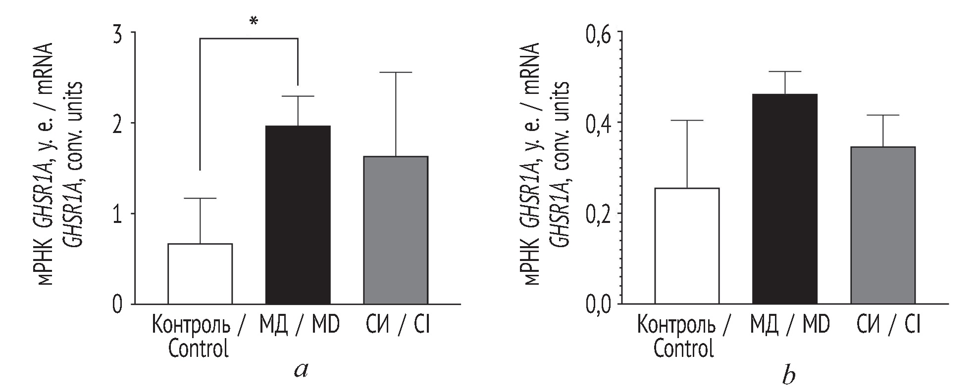 Рис. 3. Уровень мРНК GHSR1A в миндалевидном теле (а) и префронтальной коре (b) мозга крыс. *p < 0,05 по отношению к группе контроля. Контроль — группа интактных животных; МД — группа отделения от матери; СИ — группа социальной изоляции