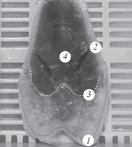 Рис. 1. Макропрепарат дистального эпиметадиафиза левой бедренной кости кролика. 1 — Гиалиновый хрящ; 2 — кортикальная кость; 3 — метаэпифизарная пластинка; 4 — костный мозг