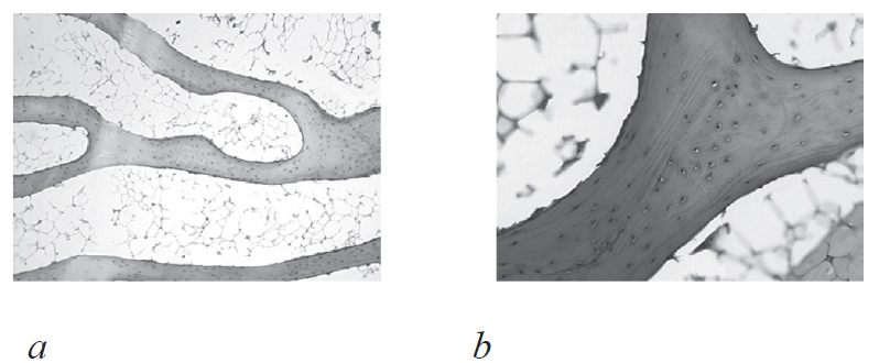 Рис. 3. Костные балки образцов контрольной группы, эндостальная зона с неактивными остеобластами, окраска гематоксилином и эозином: a — ув. ×100; b — ув. ×400