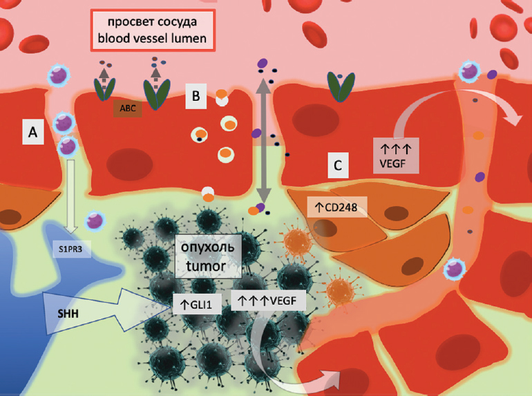 Рис. 2. Строение и функционирование гематоопухолевого барьера. А — разрушение плотных контактов из клаудина-5 и окклюдина приводит к повышенной неконтролируемой парацеллюлярной диффузии и нарушению цитосклелета эндотелиоцита. Инфильтративный рост глиобластомы вызывает смещение и разрушение отростков астроцитов. Реактивные астроциты экспрессируют сфингозин-1-фосфатный рецептор-3 (S1PR-3), что усиливает инфильтрацию Т-лимфоцитами; B — эндотелиоциты гематоопухолевого барьера характеризуются потерей многих переносчиков и наличием большого количества транспортных везикул и белков АВС; C — распределение перицитов гематоопухолевого барьера неравномерное с чередованием зон их отсутствия и областей со слоистой структурой. Дифференцирующиеся из стволовых опухолевых клеток перициты экспрессируют в большом количестве эндосиалин (CD248). Формирование новых сосудов в глиобластоме происходит посредством синтеза опухолевыми клетками и эндотелиоцитами VEGF (фактор роста эндотелия сосудов). GLI-1 — белок цинкового пальца-1
