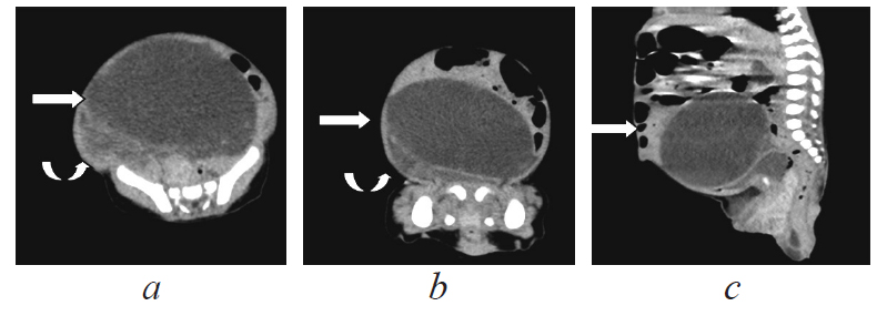 3. Fig. 2. CT reconstructions: а — axial, b — coronal, c — sagittal projections. Arrows indicate cystic formations