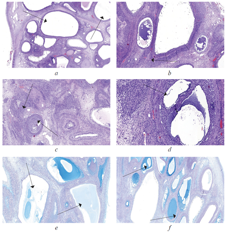 Fig. 4. Micropreparation. Ovarian tissue: аstaining hematoxylin-eosin. Magnification ×25. Big and small follicular cysts (arrows), the wall is formed by fibrous connective tissue; bstaining hematoxylin-eosin. Magnification ×40. Big and small follicular cysts (arrow), the wall is formed by fibrous connective tissue; cstaining hematoxylin-eosin. Magnification ×20. Cysts with luteinization, theca cells (arrows); dstaining hematoxylin-eosin. Magnification ×40. Cysts with luteinization, theca cells (arrow); estaining: alcyan blue. Magnification ×40. Big and small follicular cysts (arrows), the wall is formed by fibrous connective tissue; the lining of cysts is formed by multinuclear follicular epithelium; fstaining alcyan blue. Magnification ×40. Big and small follicular cysts (arrows), the wall is formed by fibrous connective tissue; the cyst lumen has basophilic alcyan-positive content
