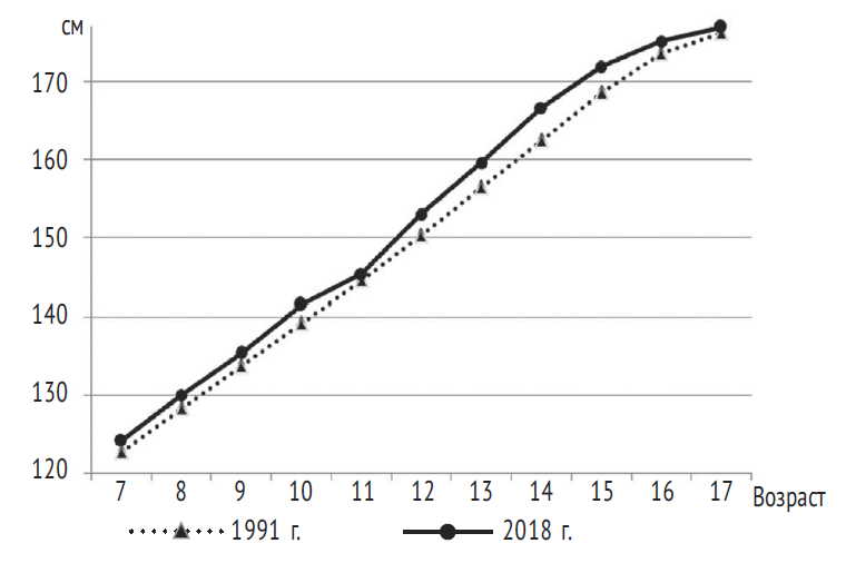 Длина тела — наиболее жестко генетически детерминированный показатель физического развития. Мы проанализировали показатели ДТ обследованных школьников и сравнили их с региональными нормативами, разработанными тридцать лет назад. Анализ данных проведен по 25, 50 и 75-му перцентилям, но, поскольку получены однотипные результаты, в данной статье мы сочли возможным представить динамику показателей ДТ только по 50-му перцентилю. Было установлено, что у современных школьников ДТ больше, чем у сверстников тридцать лет назад. У мальчиков разница величины ДТ максимальна во время пубертатного скачка роста (2,7–4,2 см), но к 17 годам она сокращается до 0,7 см (рис. 1).