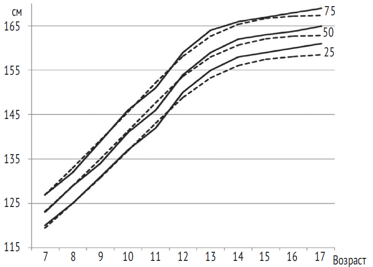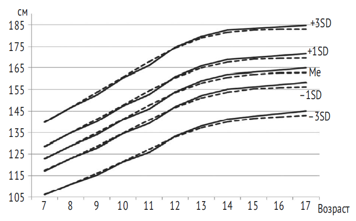 Методом случайной выборки обследовано 6207 учащихся общеобразовательных школ в различных районах Санкт-Петербурга (3225 мальчиков и 2982 девочки) в возрасте от 7 до 17 лет. На участие школьников в исследовании было получено информированное согласие их законных представителей. Детям проводили измерение длины тела (ДТ) по унифицированной методике. Возрастные группы формировали в соответствии с точным паспортным возрастом с интервалом в 1 год (± 6 мес.). Наполняемость возрастно-половых групп составила от 112 до 474 человек, что обеспечило корректность статистического анализа. Статистическую обработку материала выполняли с использованием методов вариационной статистики с помощью прикладных программ Statistica v. 10.0© Statsoft; были рассчитаны параметрические (Ме — медиана, SD — стандартное отклонение) и непараметрические параметры (25, 50 и 75-й перцентили). Проведено сравнение с показателями ДТ региональных [2] и международных нормативов [8] физического развития детей и подростков.