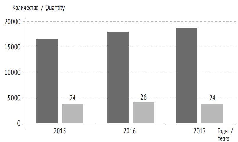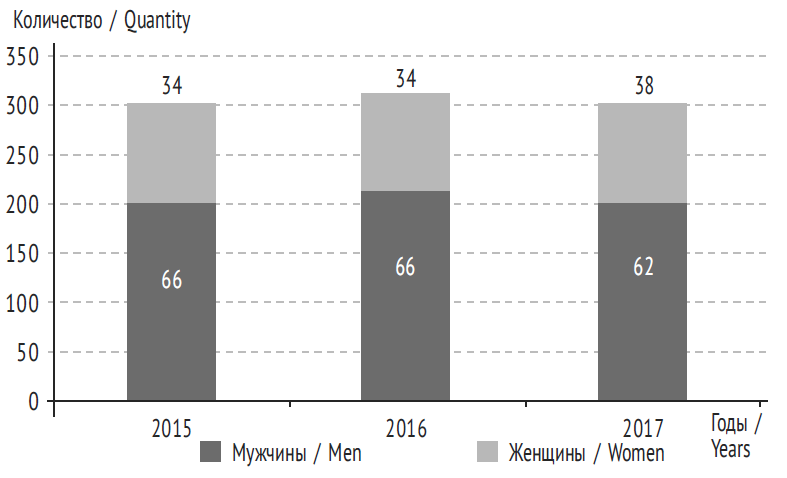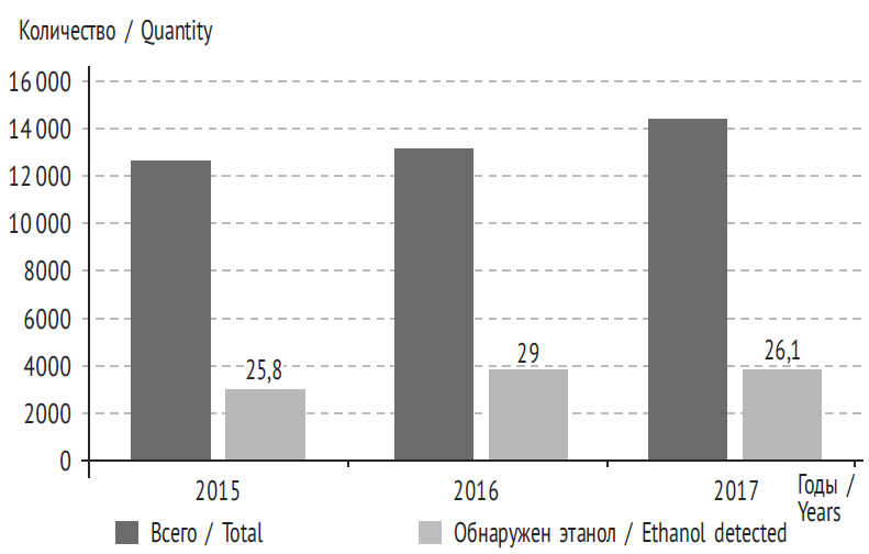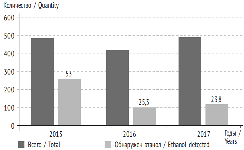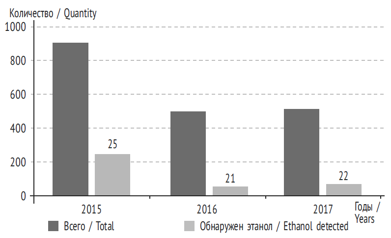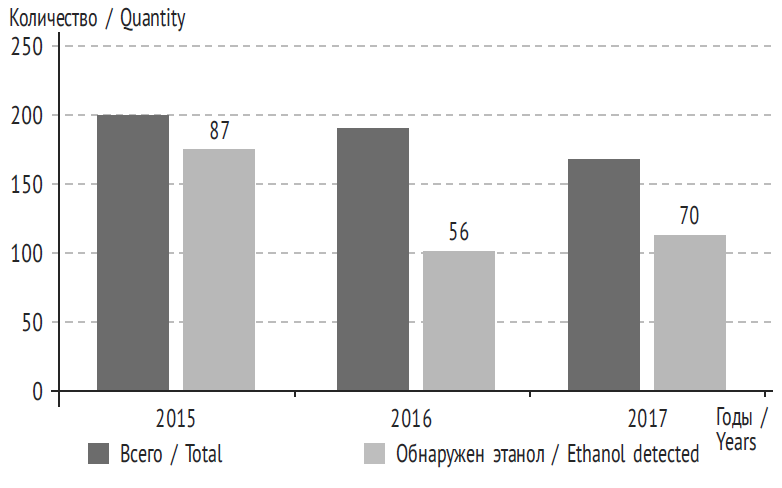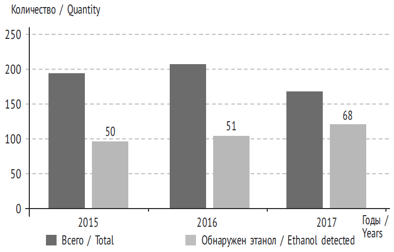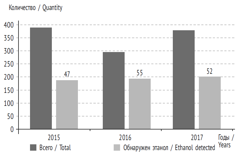 Проведенное нами исследование показало, что за 2015–2017 гг. не наблюдалось тенденции к снижению острых отравлений этанолом в структуре общей смертности (табл. 2). Нужно отметить, что количество острых отравлений наркотическими веществами (опиатами, каннабиоидами, кокаином и др.) практически в два раза превышает количество острых отравлений этанолом.
