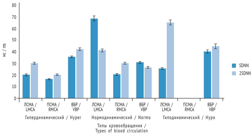 Определение вариабельности сердечного ритма показало, что у пациентов с гипердинамическим типом гемодинамики показатели RMSSD и SDNN были в 2,2 и 1,2 раза выше у больных с ишемией в бассейне ЛСМА и ВББ по сравнению с пациентами, у которых развивалась ишемия в бассейне ПСМА (рис. 1, 2).