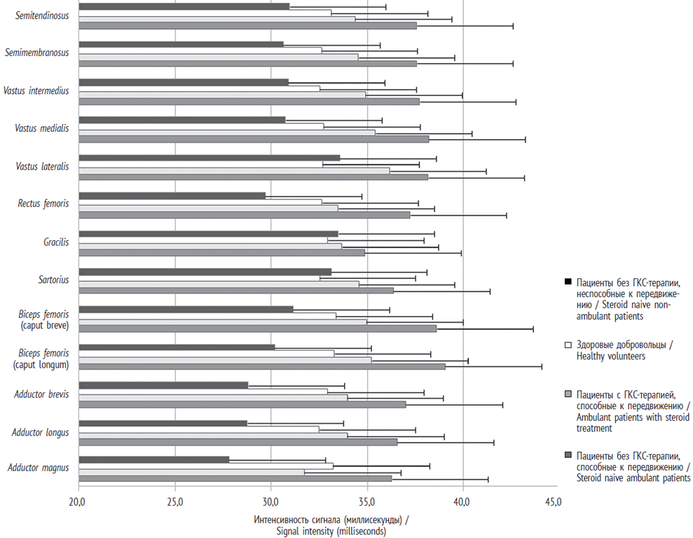 Пациенты, не получавшие ГКС-терапии и способные к передвижению, характеризовались повышением сигнала Т2 от воды во всех скелетных мышцах бедер, средние значения составили 37,3 ± 1,1 мс. В группе пациентов, получавших ГКС-терапию и способных к передвижению, также были выявлены повышенные показатели сигнала Т2 от воды во всех скелетных мышцах бедер, средние значения составили 34,4 ± 1,2 мс. В группе пациентов, не получавших ГКС-терапии и неспособных к передвижению, средняя интенсивность сигнала Т2 от воды оказалась 30,7 ± 2,0 мс. Интенсивность сигнала Т2 от воды в мышцах бедер здоровых добровольцев в среднем равнялась 32,9 ± 0,6 мс (рис. 2).