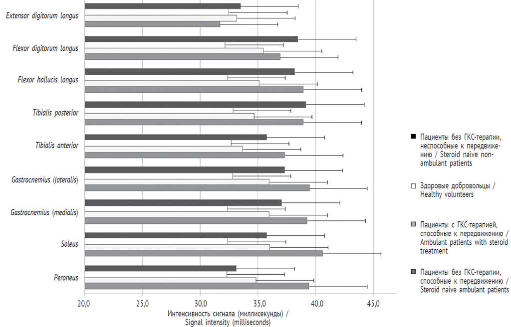 Группа пациентов, не получавших ГКС-терапии и способных к передвижению, характеризовалась повышением интенсивности сигнала Т2 от воды во всех скелетных мышцах тазового пояса, средние значения составляли 39,4 ± 1,0 мс. В группе пациентов, получавших ГКС-терапию и способных к передвижению, были выявлены повышенные показатели сигнала Т2 от воды во всех скелетных мышцах тазового пояса в среднем до 37 ± 0,9 мс. В группе пациентов, не получавших ГКС-терапии и неспособных к передвижению, интенсивность сигнала Т2 от воды составила 32,5 ± 1,8 мс. Интенсивность сигнала Т2 от воды в мышцах тазового пояса здоровых добровольцев в среднем равнялась 32,7 ± 0,7 мс (рис. 1).