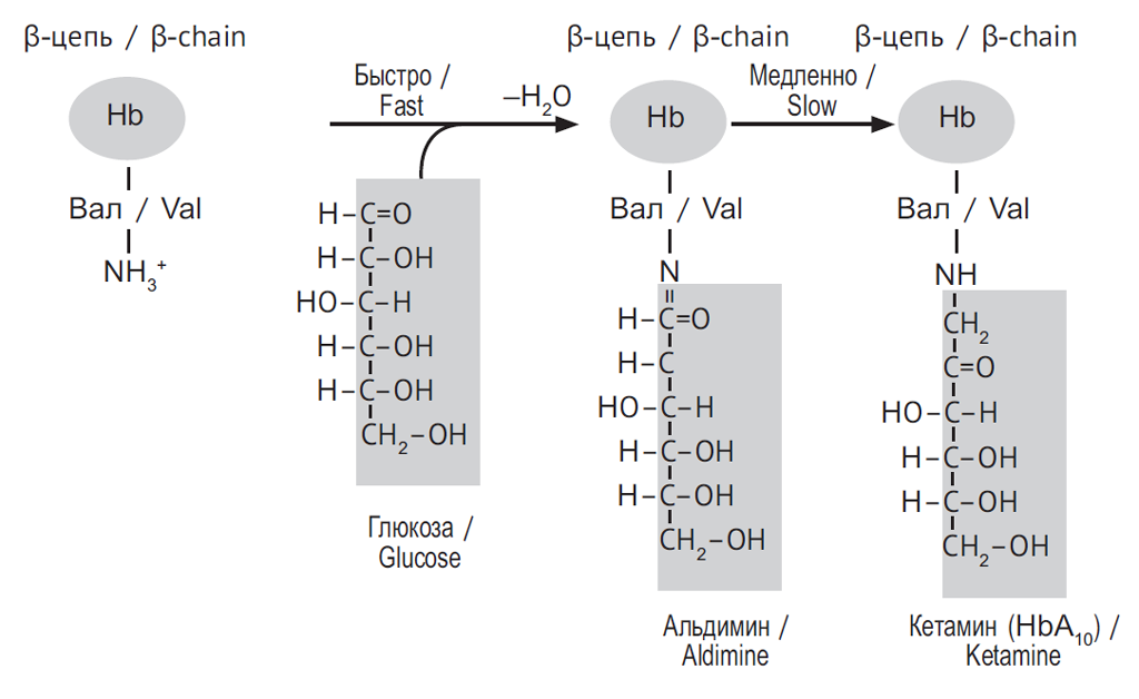 Гемоглобин человека имеет 3 типа — эмбриональный, фетальный и взрослый. Каждый из представленных типов может вступать в реакцию гликирования с различными углеводами — глюкозой, фруктозой, глюкозо-6-фосфатом и другими сахарами, образуя гетерогенную группу гликированных гемоглобинов НbА1а, НbА1b, НbА1с. Из представленной гетерогенной группы для диагностики и оценки течения сахарного диабета используется HbA1c, так как на его долю приходится большее количество, остальные фракции имеют минимальную концентрацию. В настоящее время под HbA1c понимают: гемоглобин А, необратимо гликированный по одному или двум N-концевым валинам β-цепей HbA (рис. 1). Гликирование в любом другом участке δ- или β-цепей не имеет диагностического значения.
