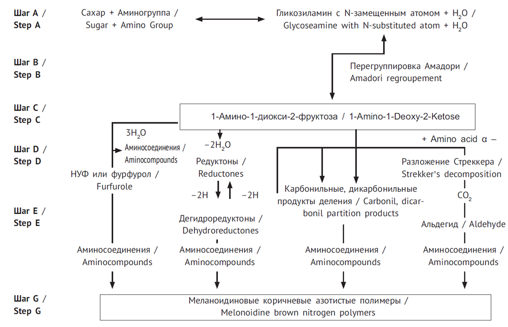 Первый этап этой реакции — конденсация [3, 4], которая начинается с присоединения карбонильной группы альдозы (глюкозы) к свободной аминной группе аминокислот с образованием альдозлизиламина (рис. 2, шаг А). В процессе этой реакции происходит дегидратация углевода с выделением воды, далее образуется основание Шиффа, которое характеризуется двойной связью углерода с азотом, который в них связан с арильной или алкильной группой (). Далее основание Шиффа приобретает кольцевую структуру. Эта перестройка называется перегруппировкой Амадори, в результате которой образуется кетозамин (рис. 2, шаг В). Если в реакцию вступают другие продукты (глюкоза, глицерин), то в результате перегруппировки Амадори также образуются и 1-амино-1-диокси-2-фруктоза (рис. 2, шаг С) или монофруктозаглицерин. Перегруппировка Амадори является важным этапом реакции Майяра.