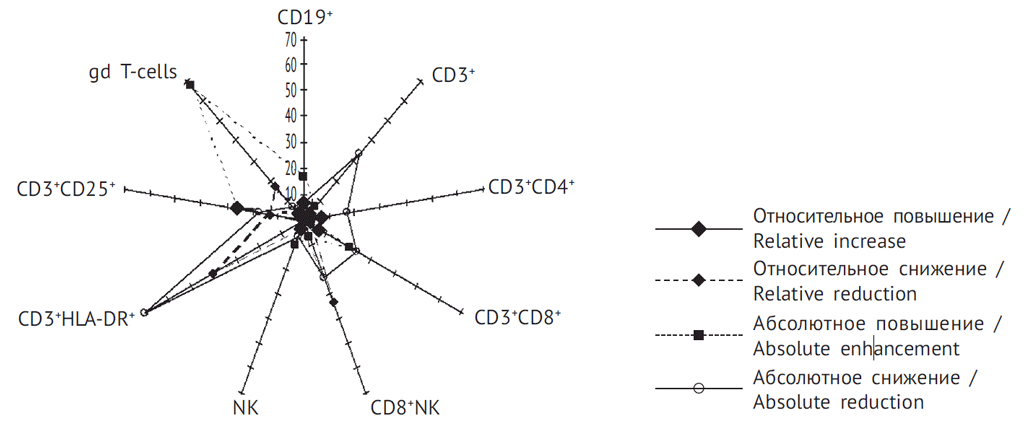 The study of the immune status was performed with first level immunological tests. Immunophenotyping of lymphocytes was performed using flow cytometry by direct immunofluorescence of whole peripheral blood and a no-wash procedure (Epics XL flow cytometer, Beckman Coulter, USA). To assess the different subpopulations of lymphocytes, the cells were stained with three-color combinations of monoclonal antibodies conjugated with FITC/PE/PC5 fluorescent dyes such as CD45/CD3/CD19, CD45/CD3/CD4, CD45/CD3/CD8, CD45/CD3/CD(16+56), CD45/CD3/CD25, and CD45/CD3/HLA-DR (Beckman Coulter, USA). Cell populations were isolated using heterogeneous gating. Absolute lymphocyte counts were calculated using reference particles. Statistical processing of the results obtained was performed using Microsoft Excel.