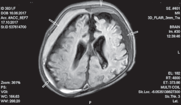 Пациентка 2 (девочка, 2 года 7 месяцев) поступила в микрохирургическое отделение СПбГПМУ с жалобами на значительное отставание в психомоторном развитии и эпилептические приступы. Из анамнеза известно, что беременность протекала на фоне хронической урогенитальной инфекции. Роды вторые срочные, путем операции кесарева сечения на фоне вторичной родовой слабости, начавшейся интранатальной асфиксии плода. Вес при рождении 3200 г. С рождения мама отмечает задержку психомоторного развития. В возрасте 2 месяцев отмечен первый судорожный приступ, на фоне повышенной температуры тела, обструктивного бронхита с дыхательной недостаточностью 2–3-й степени, сердечно-сосудистой недостаточностью 1–2-й степени. Девочка госпитализирована в реанимационное отделение Российской детской клинической больницы. Отмечались повторные афебрильные судорожные приступы. Ребенок наблюдался у инфекциониста в связи с генерализованной формой врожденной миксгерпетической вирусной инфекцией (I, IV, V типов), хроническое течение (гепатит, энцефалопатия, лимфаденопатия, спленомегалия); вторичной иммунной недостаточностью. При поступлении в клинику СПбГПМУ у ребенка сохранялись судорожные приступы в виде эпизодов тонического напряжения конечностей с отведением глазных яблок кверху, ежедневно. Получала антиэпилептическую терапию (Леветирацетам по 40 мг/кг в сутки). Пациентке проведена МРТ головного мозга: МР-признаки двусторонних хронических субдуральных гематом. Глиозно-атрофические изменения белого вещества обеих гемисфер головного мозга, больше справа. Смешанная заместительная гидроцефалия. Mega cisterna magma. Микроцефалия. Данные МРТ представлены на рис. 3. По результатам комплексного мультимодального обследования установлен диагноз: «Органическое поражение центральной нервной системы. Хронические двухсторонние субдуральные гематомы. Атрофические изменения белого и серого вещества обеих гемисфер головного мозга. Смешанная заместительная гидроцефалия. Аномалия Денди – Уокера. Грубое отставание в психомоторном и речевом развитии. Спастический тетрапарез. Псевдобульбарный синдром. Структурная фокальная эпилепсия. Частичная атрофия зрительных нервов обоих глаз. Умеренная спленомегалия». В клинической больнице СПбГПМУ выполнено оперативное вмешательство: костно-пластическая краниотомия, проведено удаление хронических многоуровневых субдуральных гематом справа. По данным послеоперационной мультиспиральной компьютерной томографии, сохранялась заместительная гидроцефалия на фоне атрофических изменений головного мозга. В сравнении с предоперационным исследованием отмечалось уменьшение объема субдуральной гематомы справа. В послеоперационном периоде судороги купированы. Проведен контроль ЭЭГ в послеоперационном периоде: регистрировался уплощенный фоновый паттерн, замедление возрастного ритма. Регистрировались единичная вспышка региональной эпилептиформной активности, высокоамплитудные деформированные комплексы «острая волна — медленная волна» в передних областях правого полушария. Пациентка с улучшением неврологического состояния, купированием эпилептических приступов (клинико-энцефалографическое улучшение на фоне продолжения антиэпилептической терапии Леветирацетамом в дозе 40 мг/кг в сутки) выписана на амбулаторное л