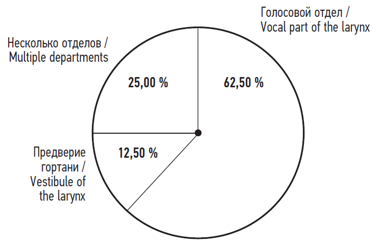 Рис. 3. Соотношение рубцовых осложнений в гортани по локализации после хирургического лечения респираторного папилломатоза