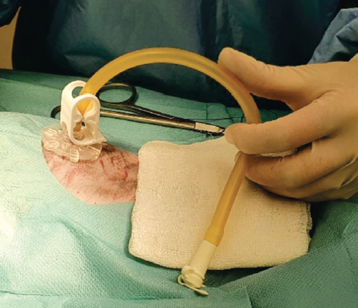 Рис. 8. Чрескожная эндоскопическая гастростомия, катетер Пеццера 18 Fr с разработанной наружной прижимной пластинкой (патент RU № 2759574 C1)