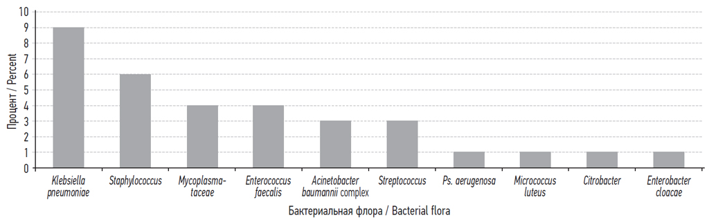 Наиболее часто при патоморфологическом исследовании новорожденных выявляли инфицирование микроорганизмами семейства Staphylococcaceae, рода Mycoplasma, а также Klebsiella pneumoniae и Enterococcus faecalis. При этом следует отметить, что именно они и являлись чаще других бактериальных агентов причиной смерти новорожденных в послеоперационном периоде (рис. 2).