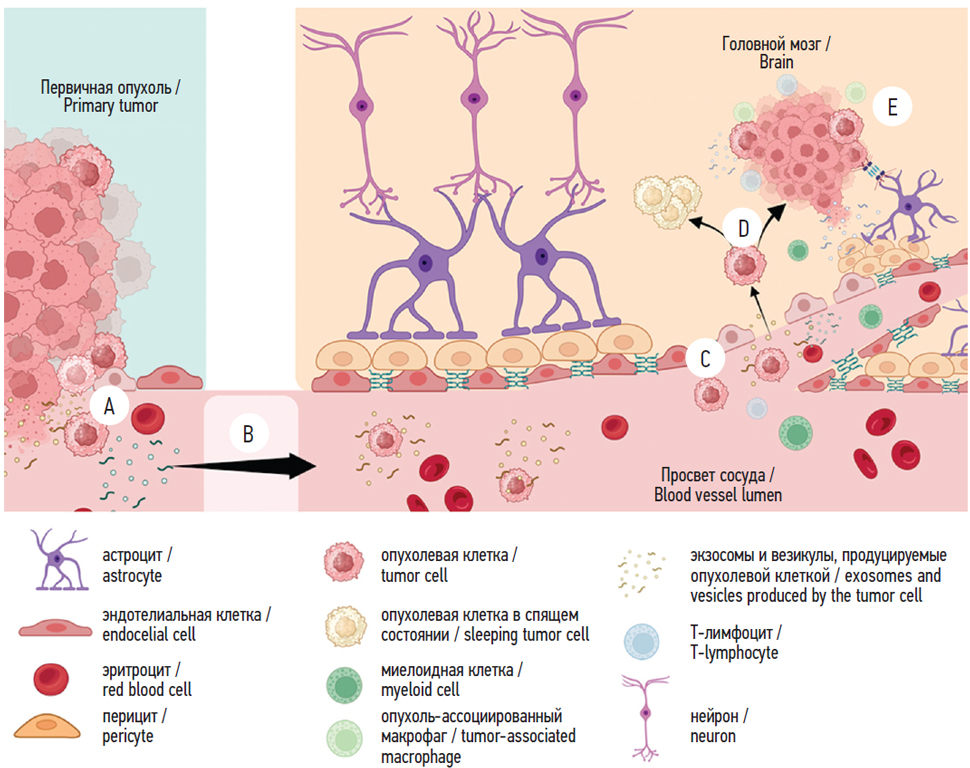 Рисунок. Механизм метастазирования в головной мозг. А — опухолевые клетки из первичного очага отбираются в соответствии с подходящим фенотипом для метастазирования в головной мозг и попадают в кровоток. Опухолевые клетки в кровоток могут выделять везикулы и экзосомы с различными микро-РНК и ферментами; B — с током крови метастатические опухолевые клетки попадают в головной мозг; C — экзосомы и везикулы, экспрессируемые опухолевыми клетками, воздействуют на каскадные белки гематоэнцефалического барьера, разрушая их; D — попадая в паренхиму головного мозга, метастатические опухолевые клетки могут переходить в состояние покоя или сразу проходят стадию адаптации (посредством приобретения новых мутаций) и образуют вторичный очаг; E — опухолевые клетки образуют щелевидные контакты с астроцитами для обеспечения переноса метаболитов и продуцируют цитокины для привлечения миелоидных клеток, которые дифференцируются также под влияем опухоли в опухоль-ассоциированных макрофагов