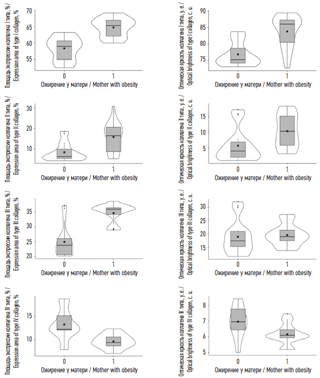 Выводы. Выявлены следующие особенности формирования соединительной ткани в плаценте у матерей с ожирением: увеличение продукции коллагена I–III типов и уменьшение продукции коллагена IV типа. Полученные результаты свидетельствуют о более раннем функционально-морфологическом изменении плаценты, чем те, что выявляются стандартными гистологическими методиками.