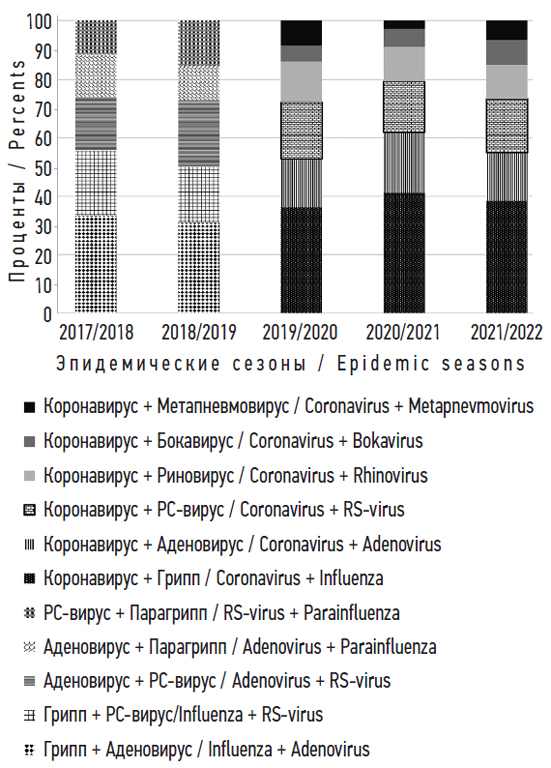 При этом в 2017/2018 и 2018/2019 гг. более частыми ассоциациями были грипп с аденовирусами (n = 9/33,4 % и 8/30,8 %), РС-инфекция c гриппом (n = 6/22,2 % и 5/19,2 %) и аденовирусами (n = 5/18,5 % и 6/23,1 % соответственно). Редко в данные эпидемические сезоны диагностировали парагрипп с аденовирусной (n = 4/14,8 % и 3/11,5 %) и РС-инфекцией (n = 3/11,1 % и 4/15,4 % соответственно).