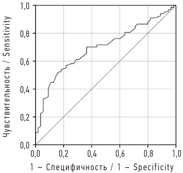 Площадь под ROC-кривой, соответствующей взаимосвязи прогноза АГ и значения регрессионной функции, обладает средним качеством модели и составляет 0,696 ± 0,048 (95 % ДИ 0,603–0,790). Полученная модель была статистически значимой (p < 0,001). Пороговое значение TGF-β в точке cut-off составляло 401,0. При TGF-β равном или превышающем данное значение прогнозировался высокий риск АГ и МС. При увеличении TGF-β более 400 пг/мл риск возникновения АГ и МС становится высоким, при меньших значениях TGF-β риск развития МС считается низким. Чувствительность и специфичность метода составили 70,1 и 63,6 % соответственно.