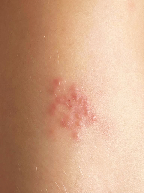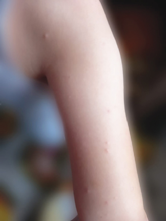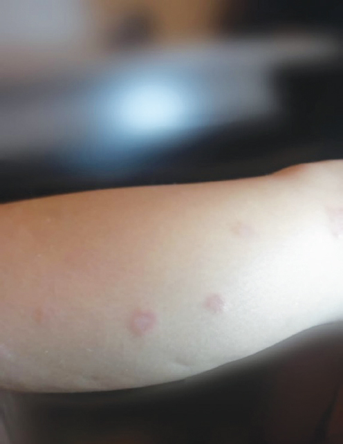 Признаки ОРВИ разрешились за 7 дней. Однако при повторном осмотре количество папул увеличилось, появились гиперемированные папулезно-везикулезные элементы в области плеча, на нижних конечностях (рис. 2). По результатам проведенного обследования на 10 дней назначен ацикловир с расчетом по весу, местно на элементы сыпи наносили косметическое средство с подсушивающим эффектом на основе оксида цинка. На фоне приема ацикловира распространение сыпи прекратилось, однако на фоне применения подсушивающего средства и крема с метилпреднизолоном, который мать применяла самостоятельно без назначения врача, визуально элементы не изменились и не уменьшилось их количество. При этом сыпь ребенка не беспокоила и представляла собой лишь косметический дефект. Была проведена беседа с матерью ребенка, разъяснены особенности течения заболевания, выбрана наблюдательная тактика. Крем на основе метилпреднизолона отменен, так как не рекомендован к использованию при вирусных высыпаниях. Было рекомендовано продолжить подсушивающее средство на гиперемированные участки кожи с везикуло-папулезной сыпью. При контрольном ОАК отмечался относительный лимфоцитоз 82 % (N 30–50), моноцитоз 10 % (N 3–9).