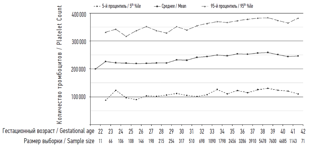 Рис. 1. Количество тромбоцитов, у новорожденных первых 3 дней жизни при гестационном возрасте от 22 до 42 нед. [117]