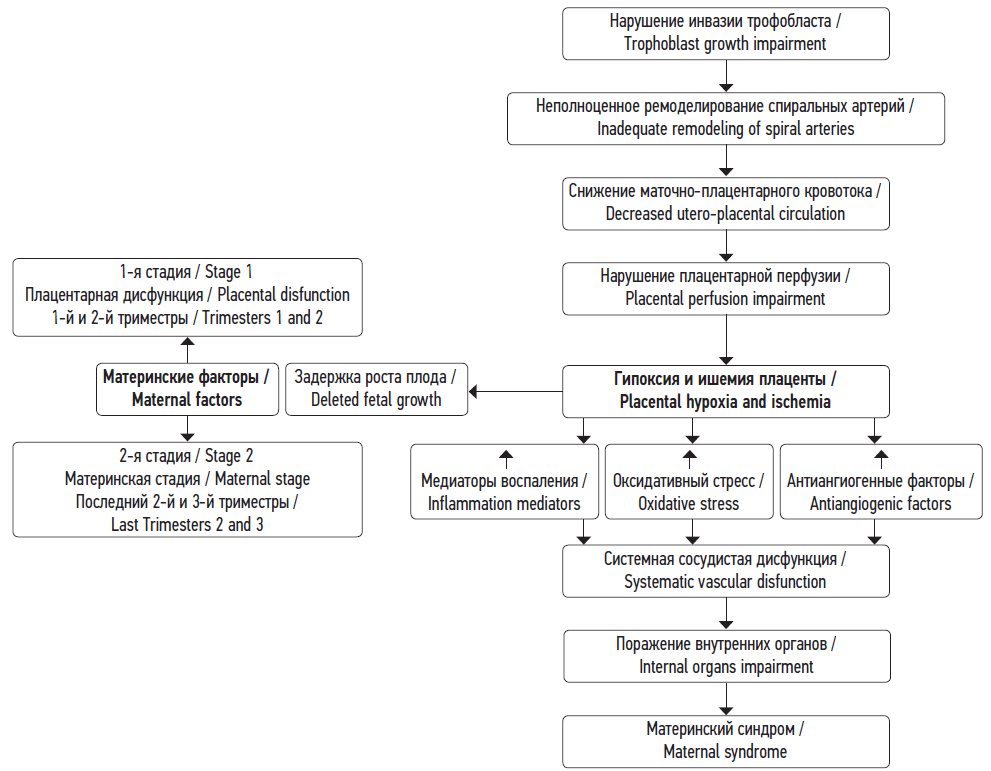 Таким образом, в настоящее время ПЭ с ранним и поздним началом рассматриваются как разные патофизиологические процессы, приводящие к общей клинической картине. Оба типа ПЭ имеют общие элементы, вызывающие схожие материнские реакции, опосредованные стрессом синцитиотрофобластов. ПЭ с ранним проявлением (до 34-й недели беременности), признана следствием дефекта плацентации, в то время как патология ССС матери считается главной причиной возникновения позднего начала заболевания (после 34-й недели).