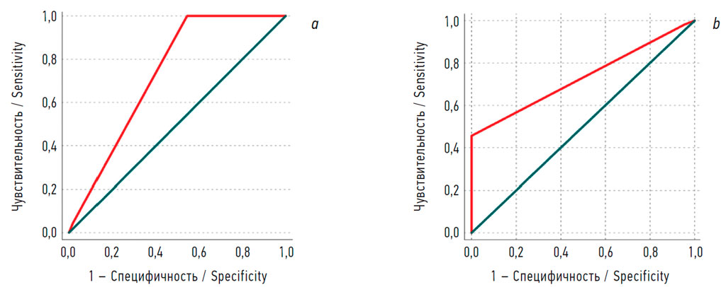 В процессе статистической обработки данных оценивали значения медианы и интерквартильного размаха [ Q 1 ; Q 3 ], статистическую значимость результатов рассчитывали при доверительной вероятности 95 %; для сравнения групп использовали непараметрический критерий Краскела–Уоллиса для независимых выборок, непараметрический коэффициент корреляции Спирмена. Для статистической обработки данных использовали алгоритм «Деревья решений», или «Деревья классификации», а также ROC-анализ, дающий дополнительные инструменты для анализа построенных моделей и их верификации.
