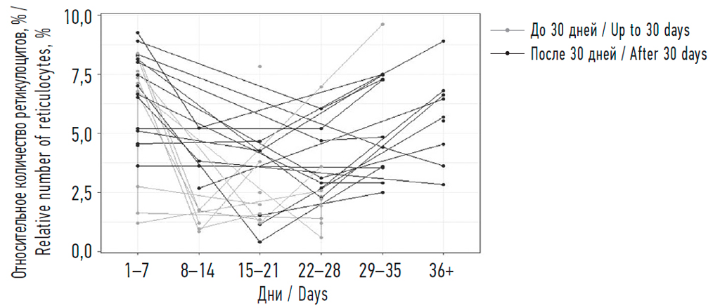 Динамику количества ретикулоцитов у недоношенных детей исследовали до манифестации заболевания, так как именно у гипорегенераторного характера РАН было решающее значение в патогенезе заболевания. Анализ динамики абсолютных и относительных показателей количества ретикулоцитов недоношенных новорожденных в первые 30 сут жизни показал, что минимальные значения количества ретикулоцитов, определяющие срок манифестации РАН, недоношенные новорожденные имели на 8–14-й дни жизни (рис. 2 и 3).