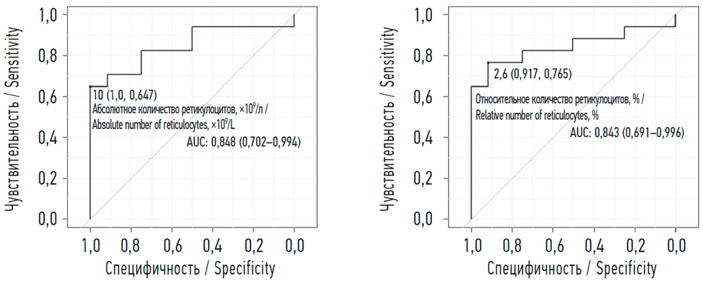 Далее на основании результатов ROC-анализа выявлена связь абсолютного и относительного количества ретикулоцитов на 8–14-е сутки у недоношенных детей со сроком манифестации анемии до 30-х суток жизни и более 30 сут. Уровни, разделяющие группы 1 и 2, для относительного количества ретикулоцитов равны 2,6 % (чувствительность 91,7 %, специфичность 76,5 %; рис. 4), для абсолютного значения ретикулоцитов равны 110×109/л (чувствительность 100 %, специфичность 64,7 %; рис. 4). Таким образом, полученные значения уровней относительного и абсолютного количества ретикулоцитов на 8–14-е сутки могут служить прогностическим фактором сроков развития РАН.