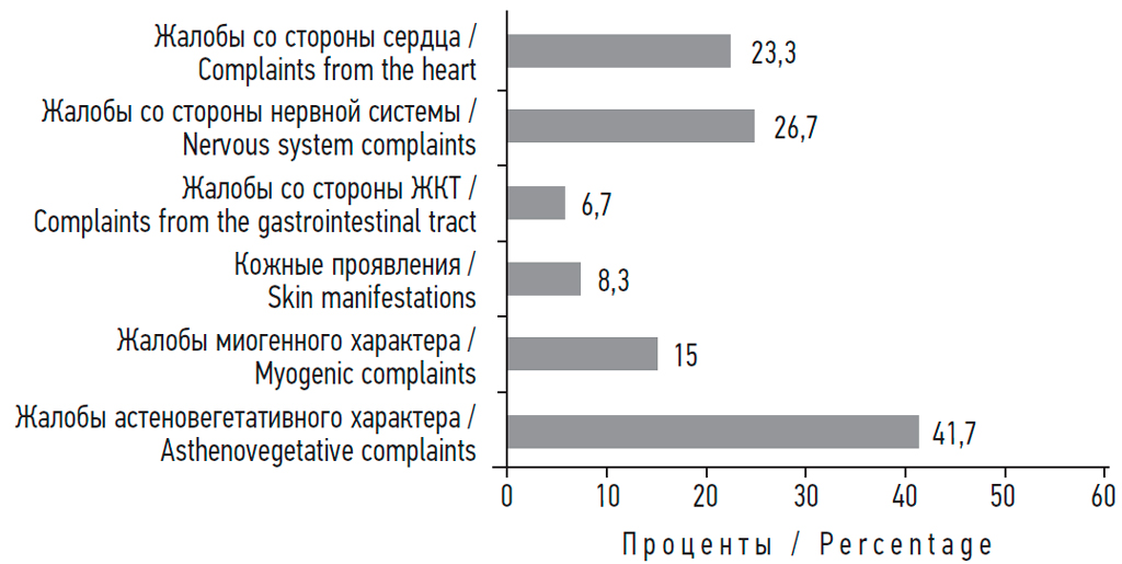В результате анализа амбулаторных карт пациентов было обнаружено, что после перенесенной НКИ пациенты 2-й группы предъявляли следующие жалобы: астеновегетативного характера (на общую слабость, утомляемость, снижение работоспособности, головную боль, головокружение) — у 25 (41,7 %) детей, миогенного характера (на мышечную слабость, боли в мышцах и суставах, судороги в мышцах) — у 9 (15,0 %) обследованных; со стороны желудочно-кишечного тракта (на тошноту, боли в животе, вздутие живота, запоры, ухудшение аппетита) — у 4 (6,7 %) детей; со стороны сердца (на нарушение сердечного ритма, перепады артериального давления, ощущение сердцебиения, боли в груди, одышку в покое и при физической нагрузке у 14 (23,3 %) пациентов; со стороны нервной системы (на ухудшение памяти, трудности в усвоении информации, ухудшение внимания, снижение успеваемости в школе, тревожность, депрессию, эмоциональную лабильность, инсомию, нервные тики, периоды снижения и повышения температуры тела, повышенную потливость, холодные кисти рук, аносмию, агивзию) — у 16 (26,7 %) детей; на кожные проявления (гиперемию, зуд кожи, сыпь, выпадение волос) — у 5 (8,3 %) обследованных. Из всех обследованных только 24 (28,6 %) ребенка не предъявляли жалоб и составили 1-ю группу исследования. Таким образом, у пациентов 2-й группы отмечали астеновегетативный синдром и жалобы со стороны нервной и сердечно-сосудистой систем (рис. 1).