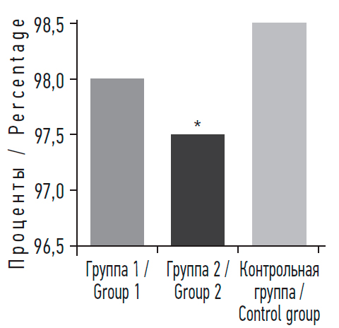 При анализе результатов пульсоксиметрии уровень сатурации во 2-й группе обследованных был достоверно ниже, чем в КГ (рис. 2).
