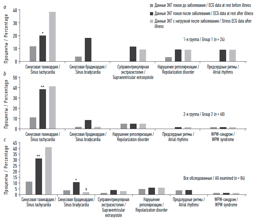 Рис. 5. Изменения на электрокардиограмме (ЭКГ) у детей, перенесших новую коронавирусную инфекцию: а — изменения у детей 1-й группы; b — изменения у детей 2-й группы; с — изменения у всех обследованных. *Достоверность различий с данными ЭКГ покоя до перенесенной новой короновирусной инфекции (НКИ), р < 0,05; **достоверность различий с данными ЭКГ покоя до перенесенной НКИ, р < 0,01; & — достоверность различий с данными ЭКГ покоя после перенесенной НКИ, р < 0,05