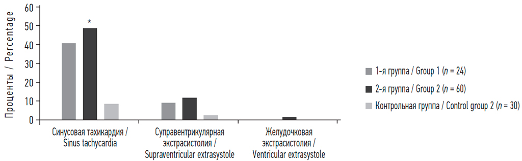 Результаты холтеровского мониторирования показали, что СТ встречается у 10 (41,7 %) обследуемых 1-й группы и у 29 (48,3 %) пациентов 2-й группы, что достоверно выше, чем в КГ — у 2 (6,7 %) детей (p < 0,001). Была также выявлена суправентрикулярная экстрасистолия у 2 (8,3 %) пациентов 1-й группы и у 7 (11,7 %) человек 2-й группы. Желудочковая экстрасистолия обнаружена у 2 (2,4 %) пациентов 2-й группы (рис. 6).