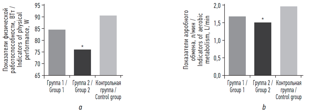 Кроме того, у детей 2-й группы по данным велоэргометрии было установлено достоверное снижение показателей физической работоспособности [Physical Working Capacity (PWC 170)] и аэробного обмена (уровень максимального потребления кислорода) в сравнении с КГ (p < 0,05) (рис. 4).