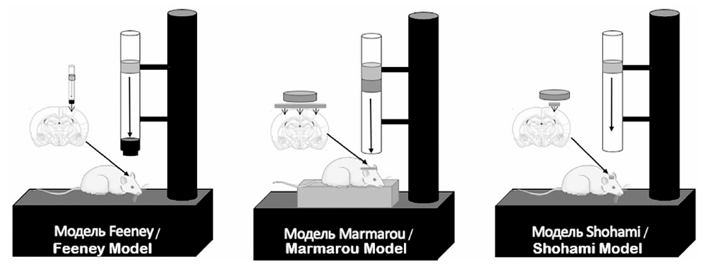 Эта модель состоит в том, что на череп животного (с/без краниотомии) свободно падает груз. Тяжесть наносимых повреждений можно контролировать с помощью массы груза и высоты, с которой груз падает. Модель падения груза дешева и легко воспроизводима для моделирования очаговых и диффузных повреждений. Недостатки данной модели: скорость и отскок груза после падения [30]. Различными группами ученых были проведены модификации данной модели, в связи с этим выделяют модели Feeney, Shohami и Marmarou, схема которых приведена на рисунке.