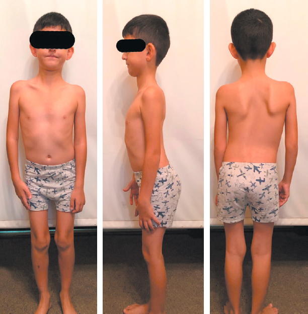 Рис. 1. Пациент, 10 лет: асимметрия плечевого пояса, крыловидные лопатки, поясничный гиперлордоз