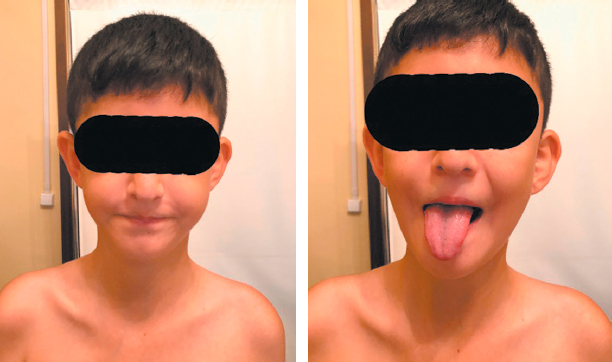 Fig. 2. Patient, 10 years old: hypomimia, weakness of the orbicularis oris muscles, asymmetry of the facial muscles