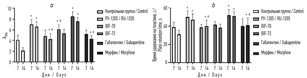 Исследования проводили в 2 этапа: через 7 и через 14 дней после моделирования патологии для оценки прогрессирования. На рис. 3 представлены графики, отражающие изменения порога болевой реакции и латентного периода удержания поврежденной конечности на холодной пластине в зависимости от времени и введенных соединений.