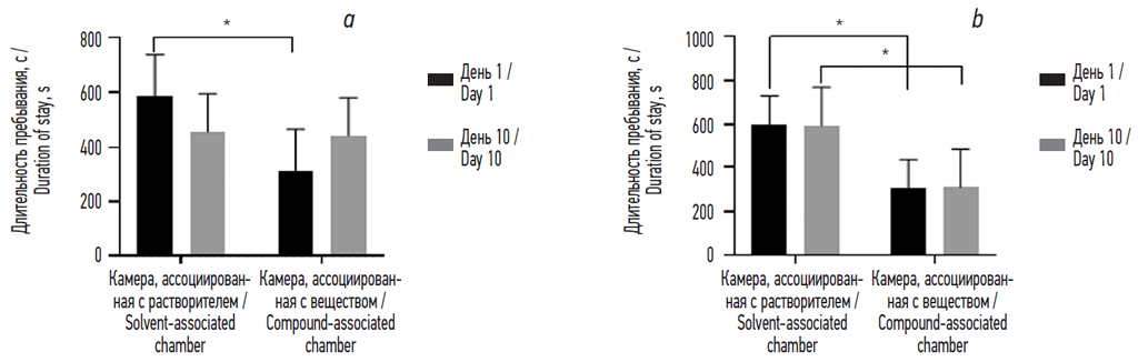Данные результаты можно сравнить с результатами, полученными для специфического каппа-опиоидного агониста U-50,488 в публикации [22]. На рис. 5 можно видеть, что на 10-й день препарат сравнения формирует статистически значимые различия, причем в сторону увеличения количества времени, проведенного в камере, ассоциированной с введением растворителя, что связывают с формированием у животных аверсивного эффекта.