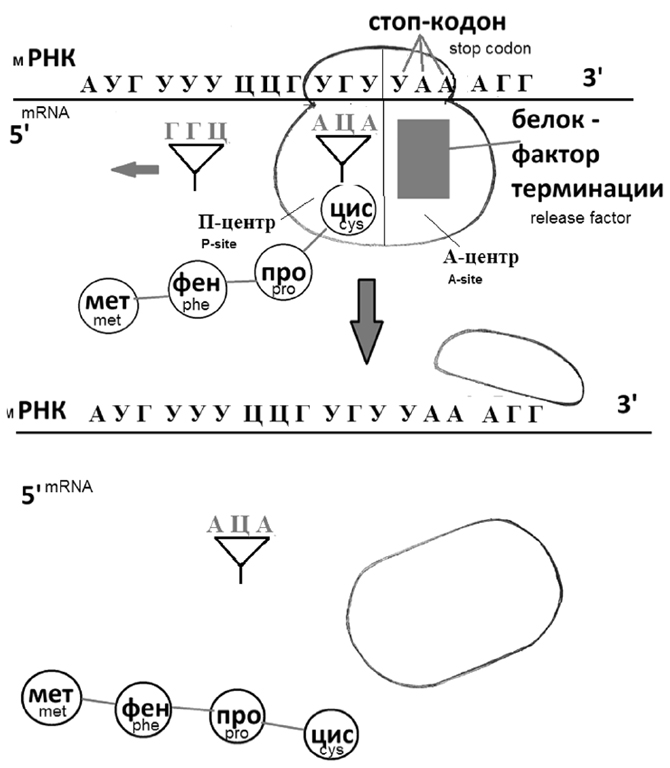 Рис. 4. Схема терминации трансляции. © Абдукаева Н.С., и др. 2019. Источник: заимствовано из [10] (схема разработана сотрудниками кафедры медицинской биологии).